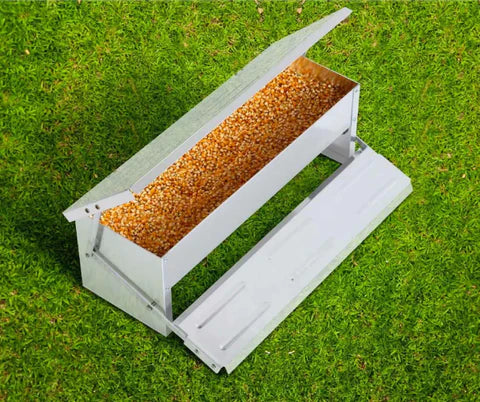 When a chicken steps on the self-activated platform, the weight-operated lid opens to release feed. The lid closes automatically when the chicken steps off, ensuring a controlled, mess-free feeding experience.