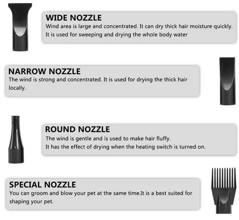 Yes, it includes multiple heat-insulated nozzles to help you style, dry, and groom your pet efficiently — without heat leakage.